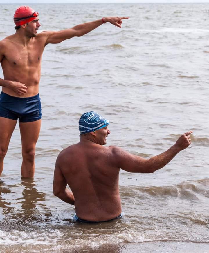 El carlospacense Santiago Gutiérrez cumplio este domingo un nuevo desafío, nadar en aguas del Mar de Ansenuza acompañado por el guardavidas de Miramar, Jonathan Aguirre.