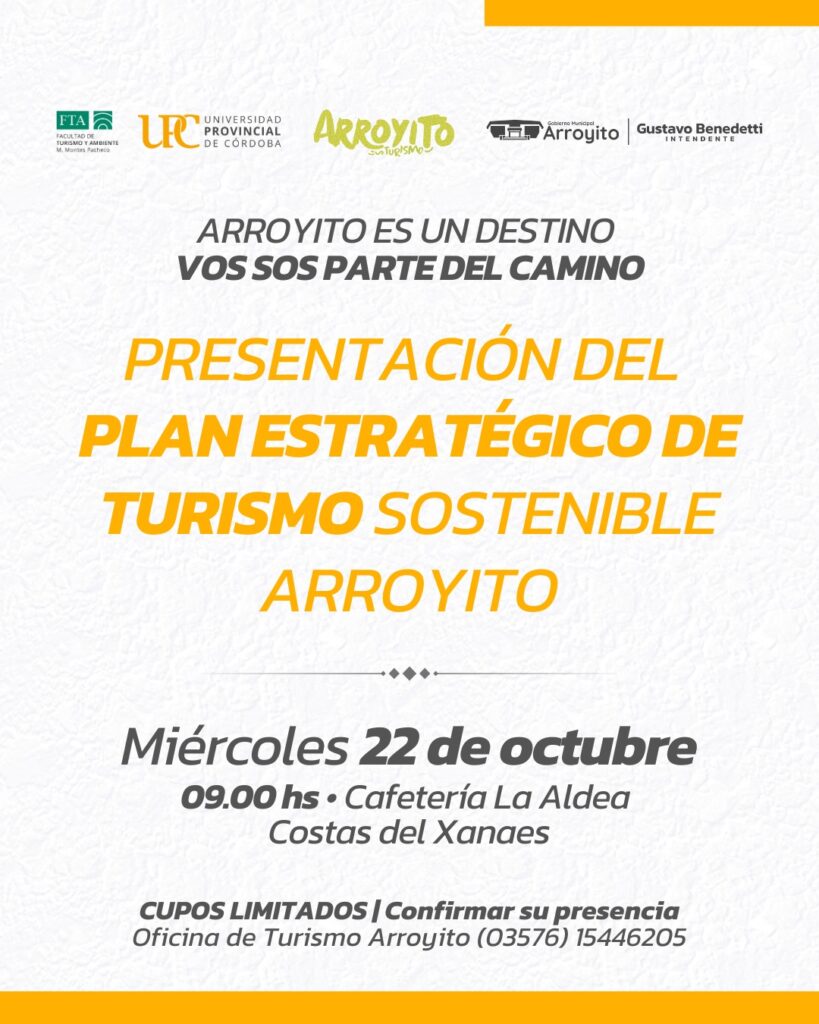 El Gobierno Municipal de Arroyito invita a la comunidad a participar de la presentación del Plan Estratégico de Turismo Sostenible, una herramienta clave que orientará el desarrollo turístico local en los próximos años.