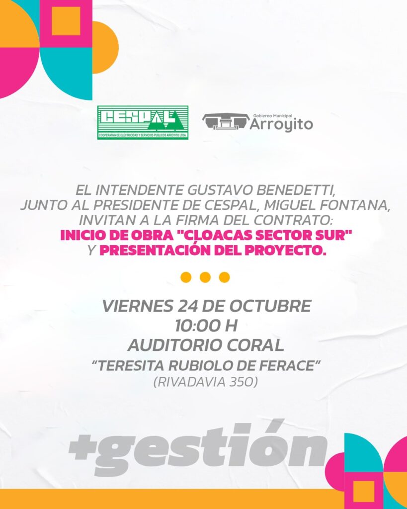 Arroyito.– San Justo: El intendente Gustavo Benedetti, junto al presidente de CESPAL, Miguel Fontana, encabezarán el acto de firma del contrato que marca el inicio de la obra de cloacas en el sector sur de la ciudad. Este proyecto constituye un paso fundamental en el desarrollo urbano y en la mejora de la calidad de vida de cientos de familias arroyitenses.
