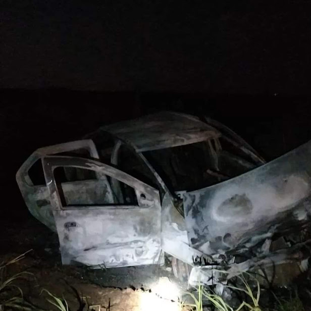 Alertados por el accidente, personal de Policía se hizo presente a 6 km al este de esta población, donde ocurrió un accidente de tránsito, protagonizado por un vehículo Renault Logan conducido por un hombre de 26 años, quien era acompañado por su pareja de 21 años y sus dos hijas de 1 y 2 años, manifestando que por causas a establecer impacto en la parte trasera de una camioneta Saveiro de color rojo, conducida por un hombre de 61 años, por el impacto el automóvil Renault se incendió en su totalidad.