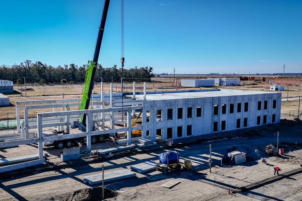 Ubicado en el barrio Don Pablo, el edificio comienza a captar la atención de los vecinos por su magnitud y proyección. Actualmente, los trabajos han ingresado en una etapa clave y de gran visibilidad, con significativos avances en el montaje de la estructura premoldeada, que empieza a delinear el volumen y la forma definitiva del edificio principal.