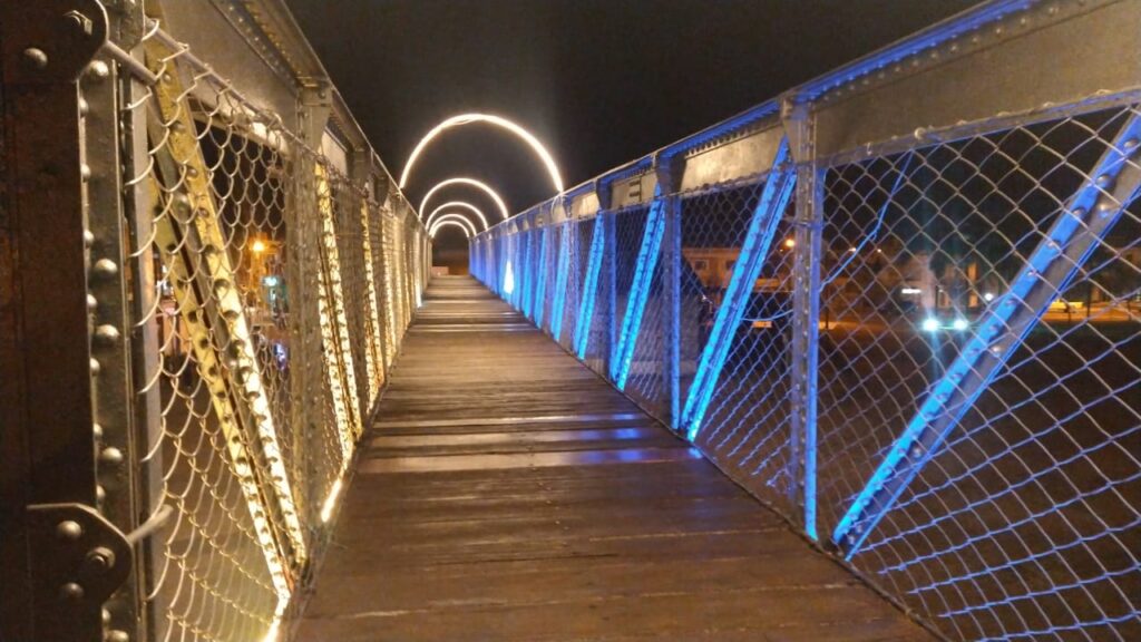 Conservando su esencia histórica, la pasarela del ferrocarril Belgrano en la localidad de Balnearia, fue revalorizada con una nueva iluminación que presenta múltiples posibilidades para adecuarla a diversos eventos sociales o turísticos.