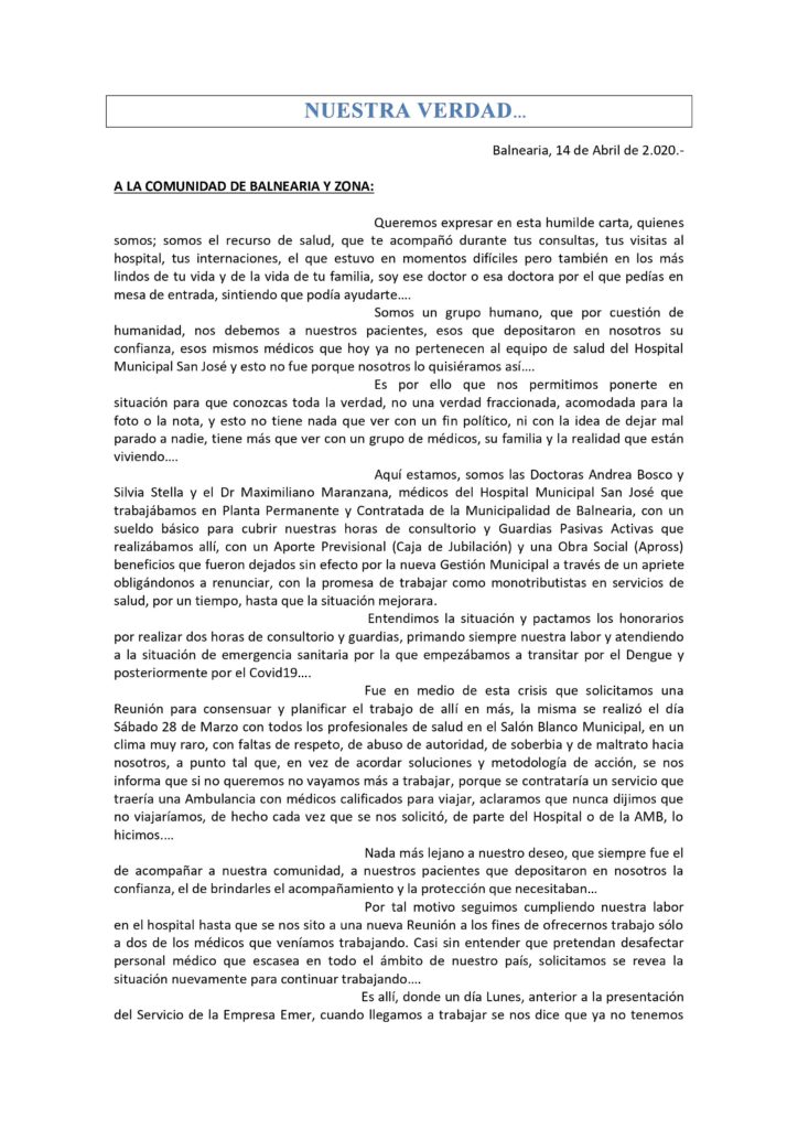 Aquí estamos, somos las Doctoras Andrea Bosco y Silvia Stella y el Dr Maximiliano Maranzana, médicos del Hospital Municipal San José que trabajábamos en Planta Permanente y Contratada de la Municipalidad de Balnearia, con un sueldo básico para cubrir nuestras horas de consultorio y Guardias Pasivas Activas que realizábamos allí, con un Aporte Previsional (Caja de Jubilación) y una Obra Social (Apross) beneficios que fueron dejados sin efecto por la nueva Gestión Municipal a través de un apriete obligándonos a renunciar, con la promesa de trabajar como monotributistas en servicios de salud, por un tiempo, hasta que la situación mejorara.
