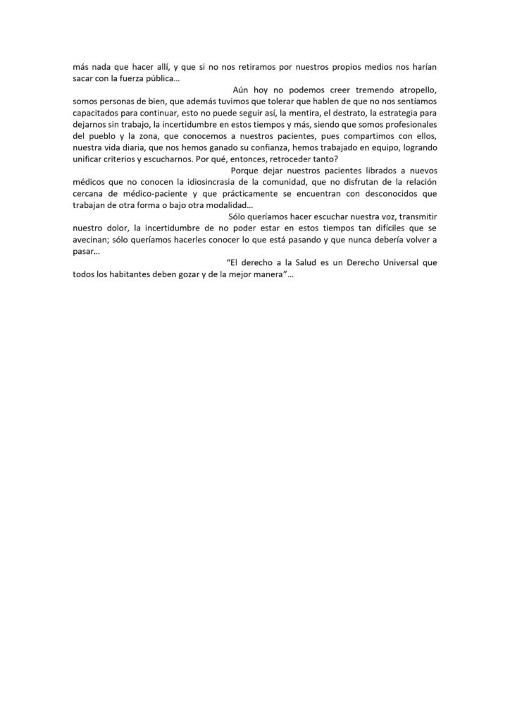 Aún hoy no podemos creer tremendo atropello, somos personas de bien, que además tuvimos que tolerar que hablen de que no nos sentíamos capacitados para continuar, esto no puede seguir así, la mentira, el destrato, la estrategia para dejarnos sin trabajo, la incertidumbre en estos tiempos y más, siendo que somos profesionales del pueblo y la zona, que conocemos a nuestros pacientes, pues compartimos con ellos, nuestra vida diaria, que nos hemos ganado su confianza, hemos trabajado en equipo, logrando unificar criterios y escucharnos. Por qué, entonces, retroceder tanto?