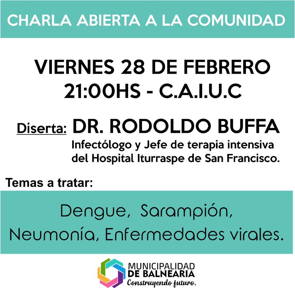 Por otra parte, se programó para este viernes 28 de febrero desde las 21 horas, una charla disertación del Dr. Rodolfo Buffa, Infectólogo y Jefe de Terapia Intensiva del Hospital Iturraspe de San Francisco. La misma está destinada a todo público y se desarrollara en el Club Independiente.