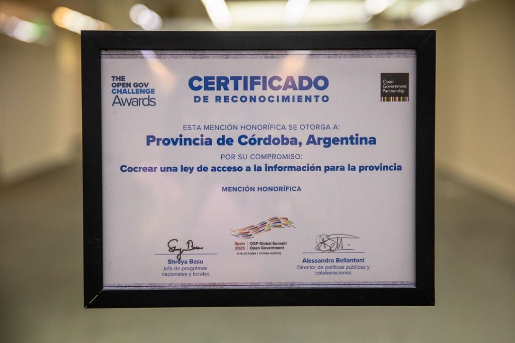 La Provincia de Córdoba, como miembro de la Alianza para el Gobierno Abierto (OGP, por sus siglas en inglés), fue reconocida en los Open Gov Challenge Awards, en el marco de la Cumbre Mundial de OGP 2025.