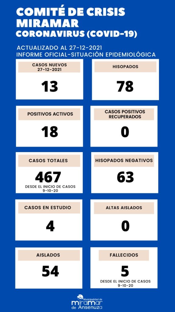 Miramar es otra de las poblaciones que sorprendió con 13 nuevos contagios detectados, llegando a 18 activos. En Arroyito son 104 los infectados, 54 informados en el último parte oficial.