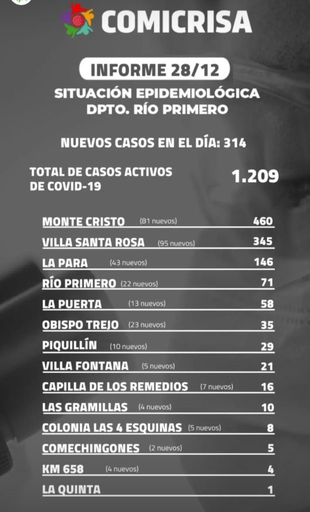 Los últimos informes emitidos de manera oficial, indican que en Villa Santa Rosa ya son 345 los casos activos, con 95 informados en la última jornada producto del resultado de testeos masivos.