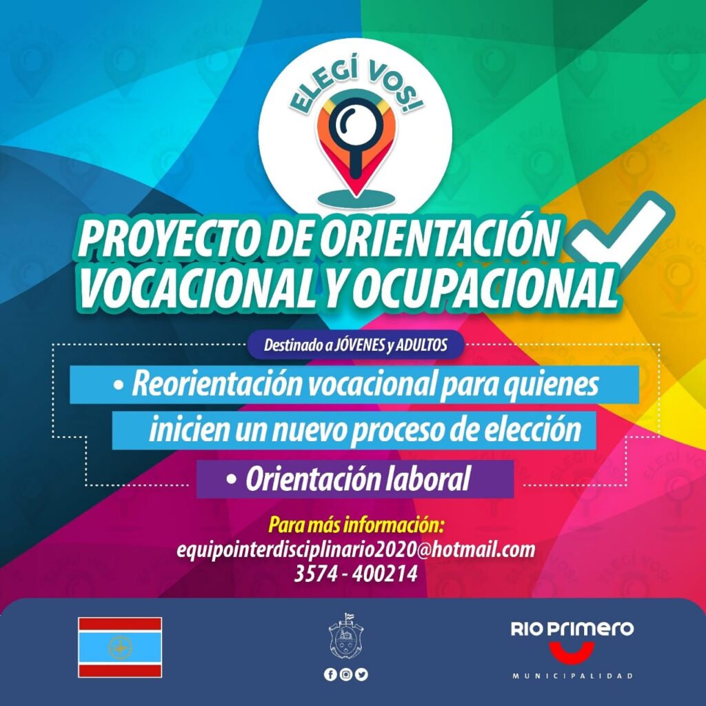 Elegí vos, es un espacio propuesto desde el Equipo Interdisciplinario de la Municipalidad de Río Primero, con la finalidad de promover la Orientación Vocacional y Ocupacional de jóvenes y adultos. Lo que se busca, es aportar información, herramientas e ideas que faciliten una elección reflexiva”.