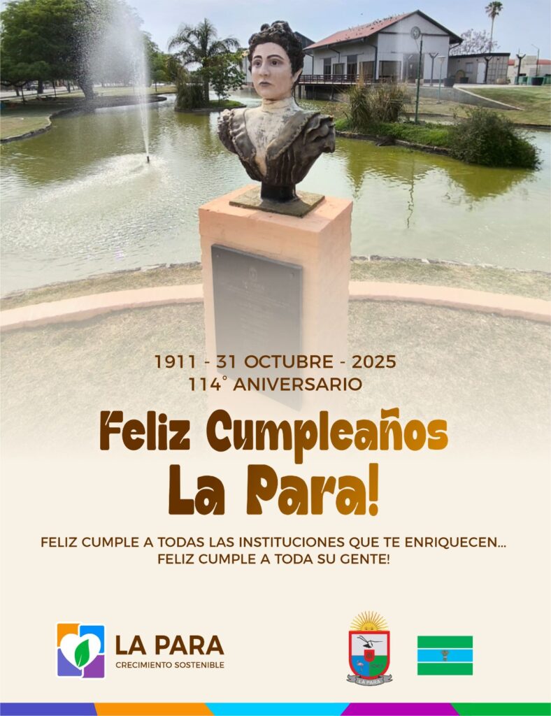 La localidad de La Para celebra este 31 de octubre su 114° aniversario, reafirmando su identidad como una comunidad pujante, solidaria y comprometida con el progreso.
