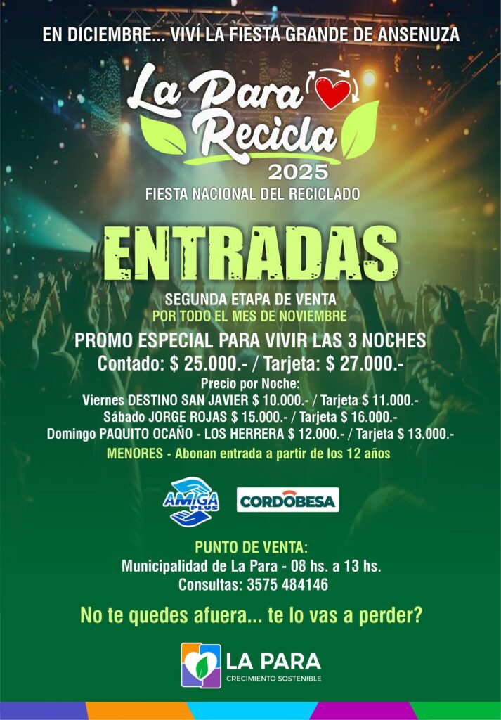 La localidad de La Para, en el departamento Río Primero, ya palpita una nueva edición de su tradicional Fiesta Nacional del Reciclado, que se desarrollará los días viernes 19, sábado 20 y domingo 21 de diciembre de 2025. El evento, conocido como “la fiesta grande de Ansenuza”, combina espectáculos musicales, propuestas culturales y un fuerte compromiso con la concientización ambiental y la economía circular.