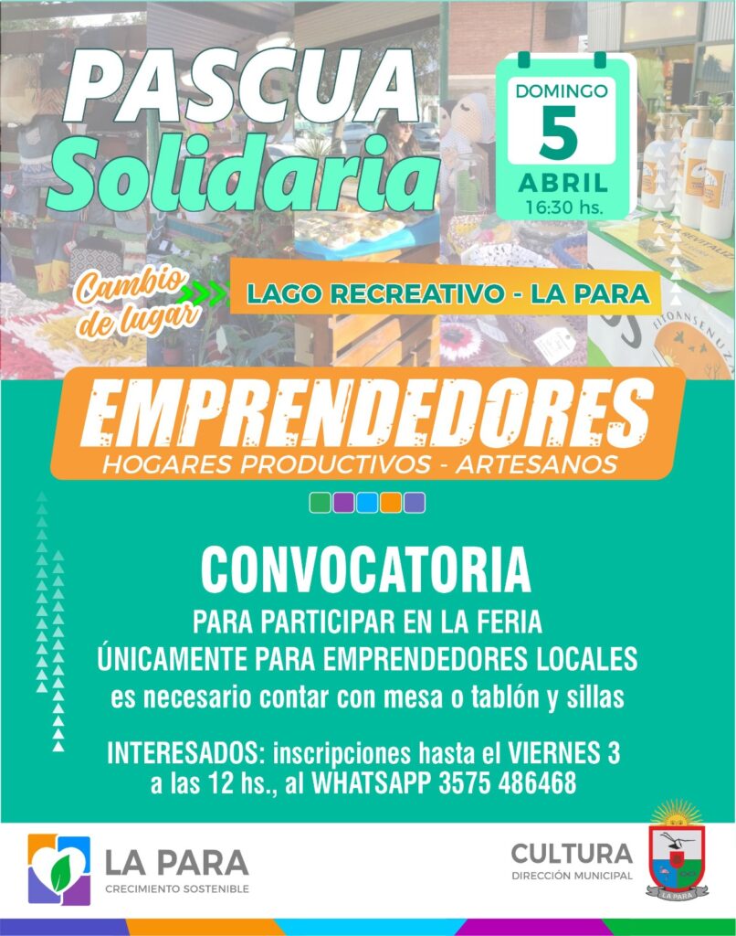 La Municipalidad de La Para organiza una nueva edición de “Pascua Solidaria”, una propuesta a beneficio de familias de Santiago del Estero. La actividad tendrá lugar el domingo 5 de abril desde las 19 horas en el Lago Recreativo, con una jornada pensada para toda la comunidad.