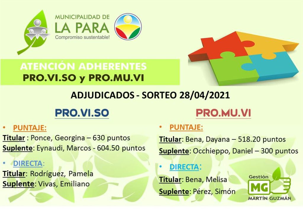 En cuanto al plan Pro Vi So fueron sorteados: Georgina Ponce (titular por puntaje) y Marcos Eynaudi (suplente); Pamela Rodríguez (titular sorteo directo) y Emiliano Vivas (suplente).