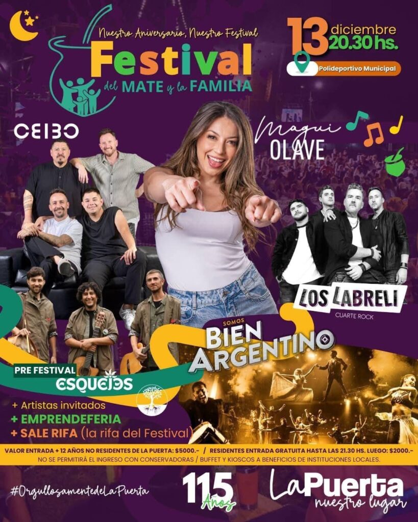 El sábado 13 de diciembre, la localidad de La Puerta vivirá una nueva edición del Festival del Mate y la Familia, una propuesta cultural enmarcada en el mes fundacional de la localidad. La celebración tendrá lugar en el predio del Auditorio Municipal, con entrada libre y gratuita para residentes, en tanrto que quienes lleguen desde la región abonaran solo $5000 .