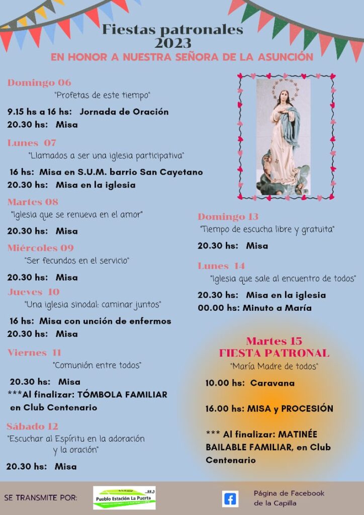 El programa de las fiestas patronales de la localidad de La Puerta tendrá diferentes actividades religiosas y sociales organizadas por la capilla local. Como todos los años, Radio Pueblo Estación La Puerta transmitirá en vivo y en directo la novena y festejos patronales.