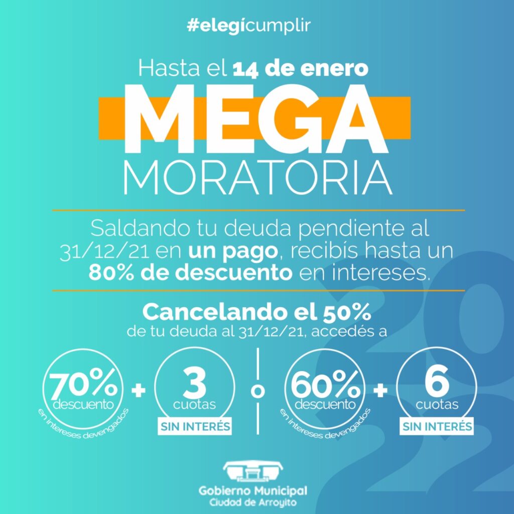 El Gobierno Municipal de la Ciudad de Arroyito a través de la Secretaría de Economía y Finanzas, informa a los vecinos que quieran ponerse al día en cuanto a deudas generadas al 31 de diciembre de 2021, que está vigente hasta el 14 de enero, el nuevo plan de Pagos con un gran descuento en intereses.
