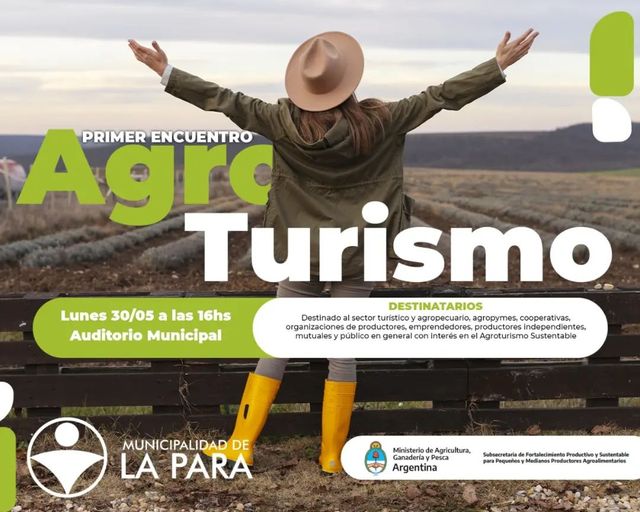 La Municipalidad de La Para, y en conjunto con la Subsecretaría de Fortalecimiento Productivo y Sustentable para Pequeños y Medianos Productores Agroalimentarios y Coordinación de Apoyo al Desarrollo Asociativo (Ministerio de Agricultura, Ganadería y Pesca) invitan a todos aquellos que tengan relación con el sector turístico y agropecuario, agropymes, cooperativas, organizaciones de productores, emprendedores, productores independientes, mutuales y público en general con interés en el Agroturismo Sustentable.
