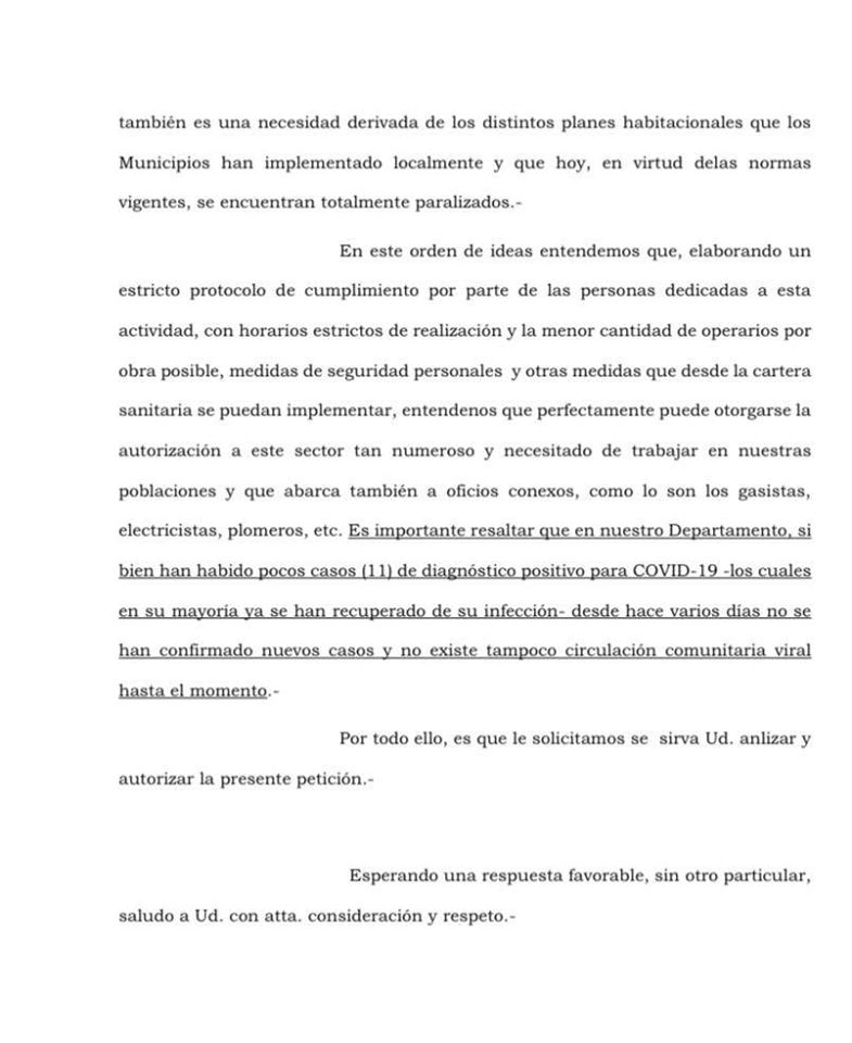 La misma tiene como objetivo lograr exceptuar del aislamiento obligatorio y prohibición de circular a la actividad de la construcción privada.
