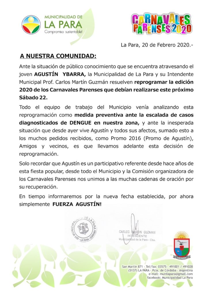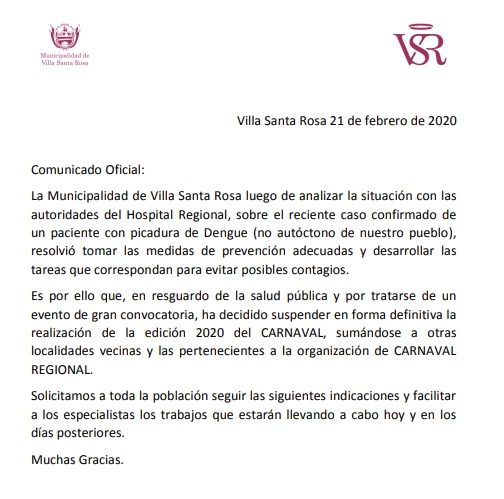 Por diversos motivos, entre ellos la situación regional y local en cuanto al dengue, los Municipios de las localidades de La Para y Villa Santa Rosa, determinaron suspender los eventos de carnaval programados para este fin de semana.