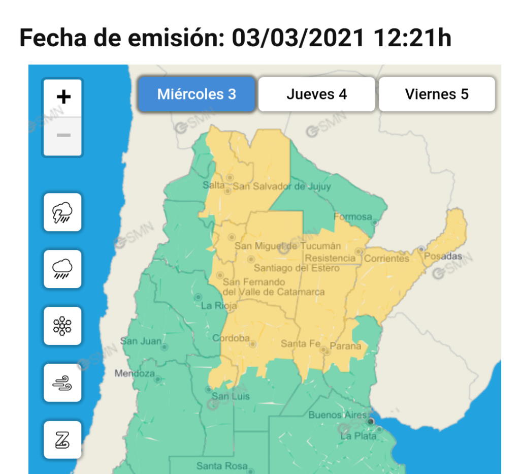 El Servicio Meteorológico Nacional emitió en la mañana del miércoles un alerta amarilla por tormentas que incluye varias provincias del país, entre ellas el norte de Córdoba.