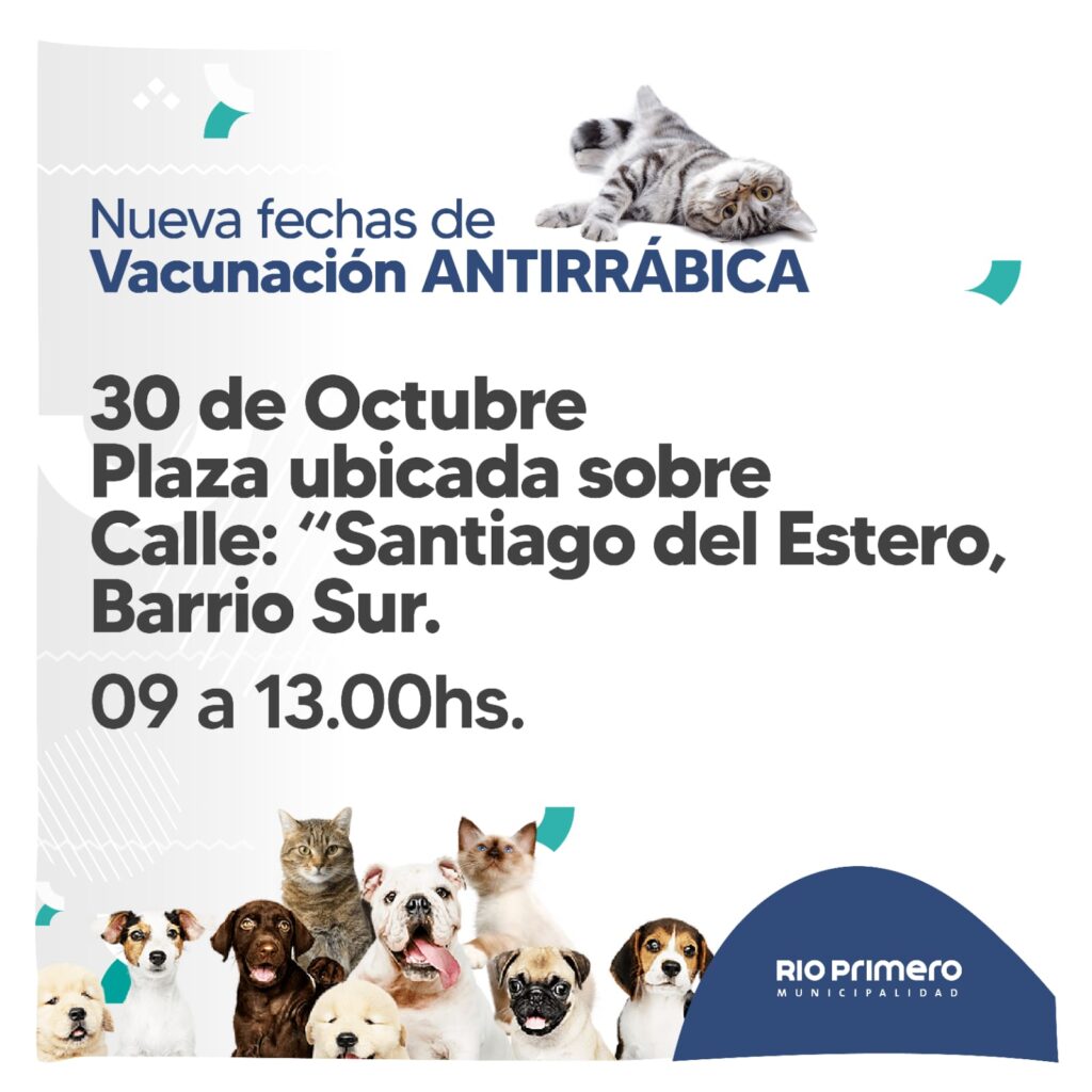La Municipalidad de Río Primero sigue llevando adelante la Campaña de Vacunación Antirrábica para caninos y felinos. La vacunación se realizará por orden de llegada, el próximo sábado 30 de octubre de 9 a 13 hs. en la plaza ubicada en calle Santiago del Estero de b° Sur.