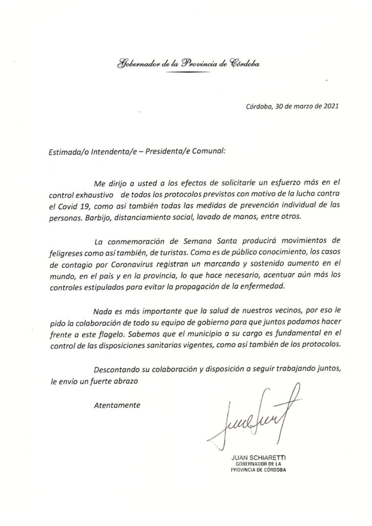 El gobernador Juan Schiaretti envió una nota, en la tarde de ayer, a los intendentes e intendentas, como así también a presidentes y presidentas de comunas, solicitando un esfuerzo más en el abordaje y control de las medidas preventivas en este contexto de la pandemia del coronavirus.