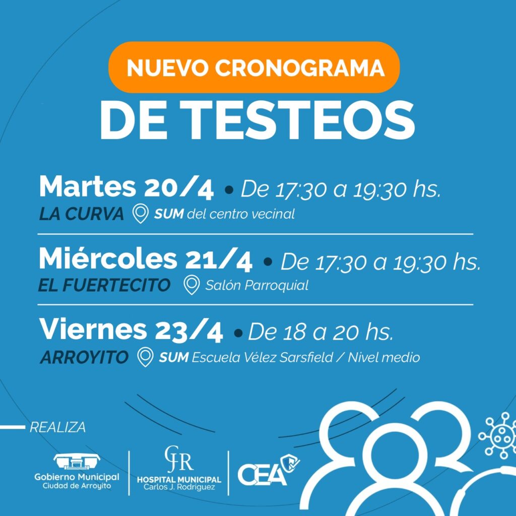 El Gobierno Municipal, el Centro de Emergencias de Arroyito y el Hospital Municipal informan que por disposición del Intendente Gustavo Benedetti, se realizará un nuevo cronograma de testeos en la ciudad, con el objetivo de mitigar las posibilidades de contagio del covid-19.