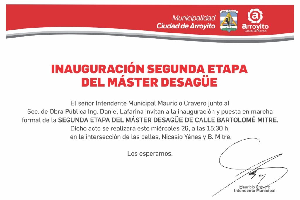 Se concretará en la tarde de hoy la inauguración y puesta en marcha formal de la Segunda Etapa del Máster Desagüe de calle Bartolomé Mitre en la ciudad de Arroyito.