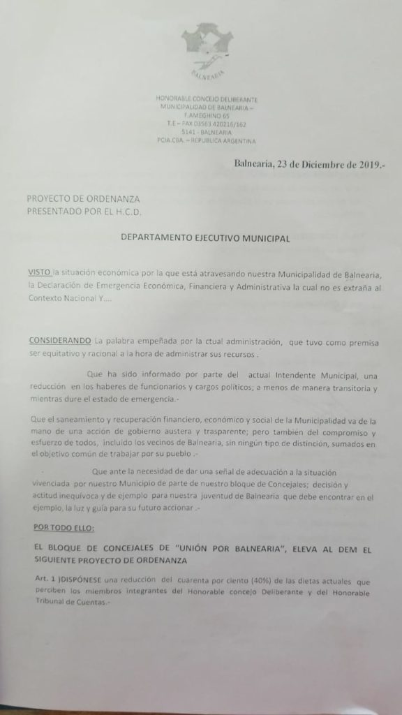 En sesión extraordinaria del Honorable Concejo Deliberante de la Municipalidad de Balnearia, se decidió por unanimidad aprobar una reducción de la dieta de los integrantes del organismo, quienes cobraban hasta el momento un aproximado de 18 mil pesos y pasarían con esta medida a recibir unos 11 mil pesos, generando entre sueldos y cargas sociales, un ahorro que ronda 1,3 millones de pesos en el año.