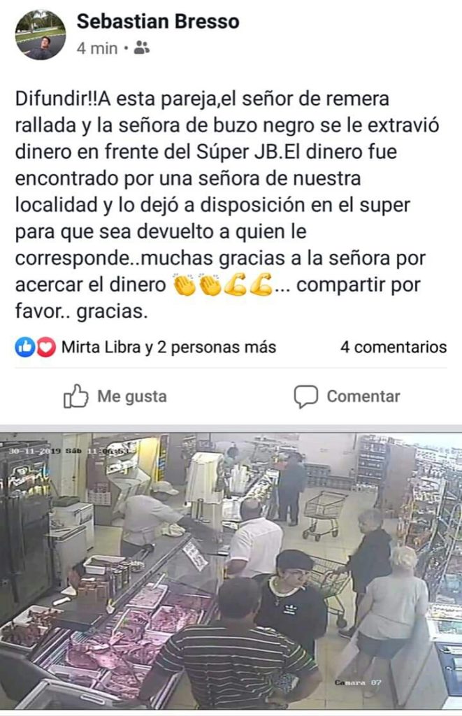 Los responsables del supermercado JB  ubicado frente a la Plaza de Las Américas en Miramar de Ansenuza, difundieron una imágen tomada por una cámara interna del local, manifestando que se encontraban  en la búsqueda de una pareja que extravió dinero frente a este comercio.