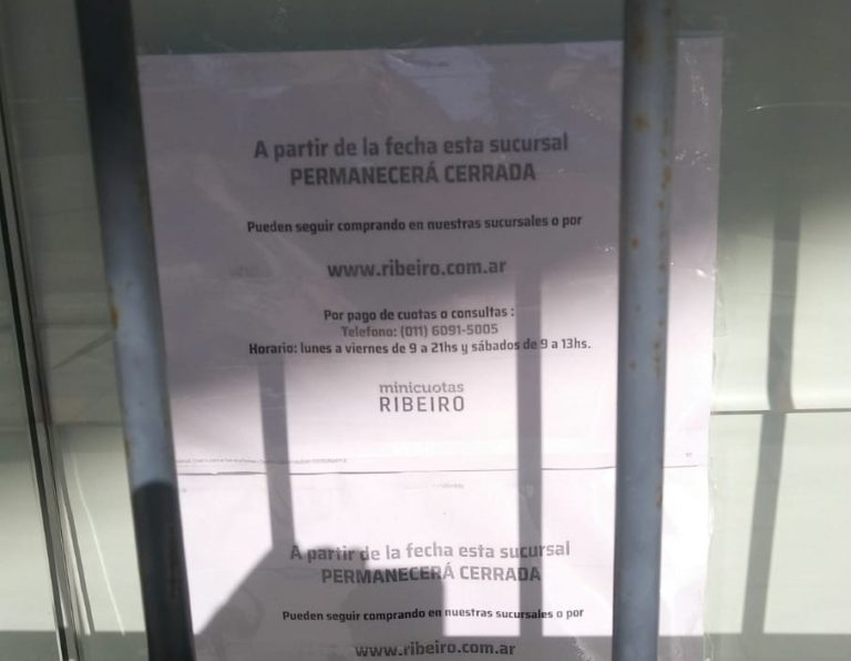 28 noviembre, 2019«A partir de la fecha esta sucursal permanecerá cerrada», se puede leer en un cartel pegado en el vidrio del local de Ribeiro que, hasta ayer atendía con normalidad, en la esquina de Rivadavia y Pagani de la ciudad de Arroyito.
