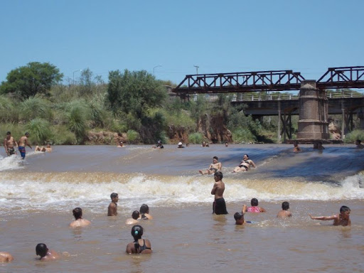 “Hacia 1927 una cascada que había al norte del actual puente ferroviario comenzó a correrse hacia el sur, amenazando llegar a los cimientos del puente ferroviario. Ese accidente hidrológico fue el origen del actual balneario: las cuadrillas del ferrocarril, dirigidas por los ingenieros Fernando Campos y Juan Mateucci y el inspector Filemón Fernández lograron contener la cascada creando una artificial que sirviera de azud nivelador. Para ello primero vertieron enormes cantidades tierra y piedra (tres vagones) sin resultados, por lo que luego debieron crear un complejo sistema de vías económicas (tipo Decauville) para colocar piedras traídas en 15 vagones. Así se logró salvar el puente ferroviario, el que recibió en la prensa el nombre de “puente de la muerte”.