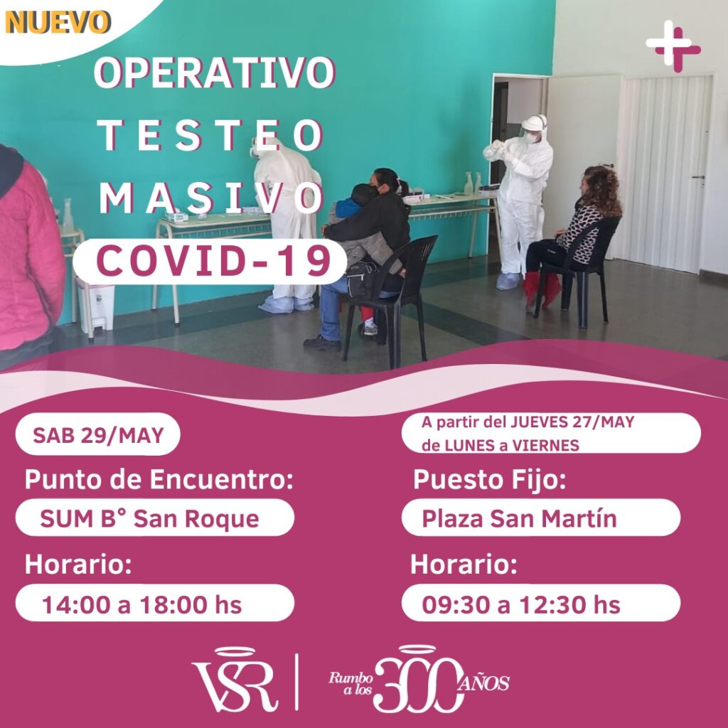 A partir de este jueves 27 de mayo, se instala un puesto fijo en la plaza San Martín que funcionará de 9.30 a 12.30 horas, en tanto que el sábado 29 de mayo se efectuará un operativo de testeos en Barrio San Roque. El horario será de 14 a 18 horas en el SUM.